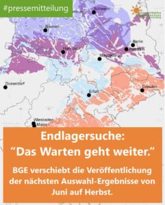 Die Bundesgesellschaft für Endlagerung (BGE) verschiebt einen weiteren Zeitplan: Den nächsten Zwischenstand bei der Suche nach geeigneten Endlagerstandorten will sie nun erst am 27. Oktober 2026 vorlegen – statt wie geplant am 24. Juni. Das gab BGE-Kommunikationschefin Dagmar Dehmer am Mittwochabend bei einer Veranstaltung des Planungsteams Forum Endlagersuche (PFE) bekannt. In der Pressemitteilung der BGE…