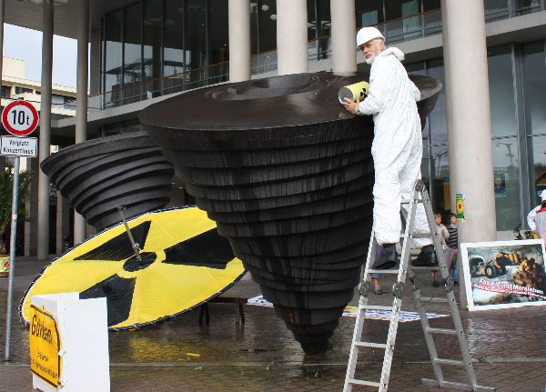 Eine fulminante Endlager-Erkundungs-Show legte eine Aktivisten-Gruppe aus Gorleben am Samstag Vormittag vor dem Freiburger Konzerthaus hin.