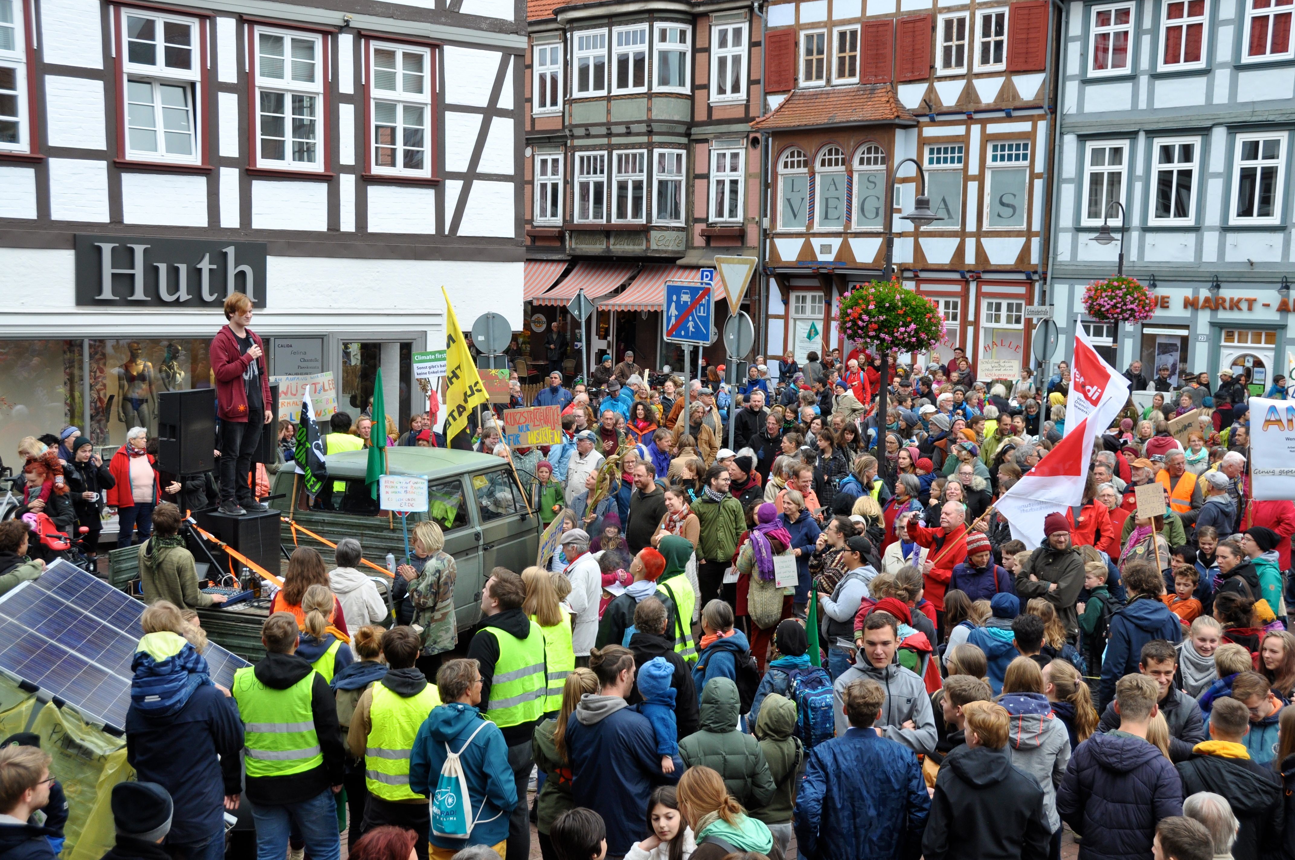 Mehrere Radtouren führten bereits am Morgen in einer „Sternfahrt“ aus dem Norden (Hitzacker, Dannenberg), Westen (Waddeweitz und Sallahn), Osten (Lemgow) und Süden (Clenze) zum Lüchower Marktplatz. Schon daran beteiligten sich über 150 Radler*innen. Auf dem zentralen Platz in Lüchow wurde es dann richtig voll. Nach einer Auftaktkundgebung führte die bunte Demo durch die Stadt bis vor das Kreishaus, wo eine Zwischenkundgebung stattfand. Den Abschluss nahm die Runde durch Lüchow auf dem Marktplatz, insgesamt folgten etwa 2.000 Menschen dem Aufruf zum Klimastreik. Mehr als 20 Organisationen und Initiativen, darunter die BI, riefen dazu auf.