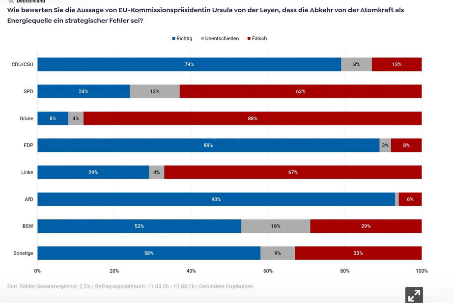Dieses Pro-Atom-Trommelfeuer hat Auswirkungen. Krieg, Krisen und Ängste befördern „einfache Lösungen“. Umfragen zeigen, wie sich das auswirkt. Eine Mehrheit in Deutschland hält inzwischen den Atomausstieg für falsch, interessanterweise eher ältere Menschen, das hätte ich nicht gedacht, weil sie die Harrisburg, Tschernobyl und Fukushima, die Auseinandersetzung um die Atomkraft miterlebt haben.