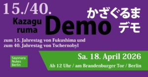 Auch dieses Jahr unterstützt die BI wieder den Aufruf zur „Kazaguruma Demo“ anlässlich des 15. Jahrestages von Fukushima und des 40. Jahrestages von Tschernobyl,die am 18. April am Brandenburger Tor in Berlin stattfindet.