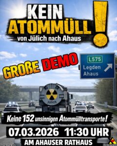 Aufruf zur nächsten großen Demonstration am 07. März 2026 vor dem Ahauser Rathaus: Atommüll-Alarm auf den Autobahnen! Castor-Transporte von Jülich, Garching & Berlin stoppen! – alle Infos hier