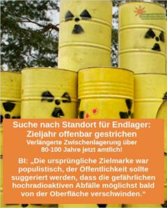 Das Bundesumweltministerium nennt kein zeitliches Ziel mehr für die Entscheidung, wo in Deutschland ein Atommüllendlager für hoch radioaktive Abfälle errichtet werden soll, das vermeldet der Deutschlandfunk. In einem Referentenentwurf zur Novelle des Standortauswahlgesetzes (StandAG) werde das ursprüngliche Zieljahr 2031 ersatzlos gestrichen. Die Bürgerinitiative Umweltschutz Lüchow-Dannenberg (BI) sieht in diesem Schritt „ein Stück Ehrlichkeit“.