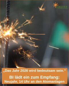 | Do. 01.01.2026 14 Uhr | Gorleben, Atomanlagen Treffpunkt Beluga-Dreieck | Neujahrstreffen der BI Umweltschutz Umtrunk und Ausblick auf das Neue Widerstandsjahr 2026 |