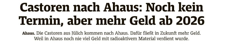 Anti-Atomkraft-Initiativen in Ahaus und Gorleben sind empört. Grund dafür ist, dass der Ahauser Bundesabgeordnete Jens Spahn (CDU) bei den Verhandlungen zum Staatshaushalt durchsetzen konnte, dass die beiden Kommunen mit den ältesten Atommüll-Zwischenlagern ab 2026 höhere Ausgleichszahlungen erhalten. Ahaus und Gorleben bekommen dann laut Münsterland Zeitung jährlich zwei Millionen von der bundeseigenen Gesellschaft für Zwischenlagerung (BGZ).
